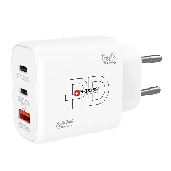 Dieses ultrakleine, leistungsstarke Ladegerät USB-C 65 W GaN PD EU von SKROSS® sorgt bequem für einen vollen Akku und lädt Ihren Laptop oder Ihr USB-Gerät (2 x USB C, 1 x USB A) mit 65 W Leistung. Kompatibel in mehr als 160 Ländern mit dem Euro-Steckdosenstandard. Mithilfe von Power Delivery (PD) kann es einen Laptop, ein Smartphone, ein Tablet, ein Audiogerät und vieles mehr ultraschnell aufladen. Ultraklein und mit der neuesten GaN-Technologie ausgestattet.